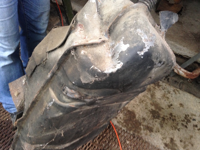 Nádrž a výfuk jsou poškozené, ale ne nějak závažně, objevili jsme i kola, ale všechna jsou silně poškozena, jedině, že by je někdo mermomocí chtěl, nechal si je vyvařit, vysoustružit, tak by z toho mohla být pěkná originální kolesa.